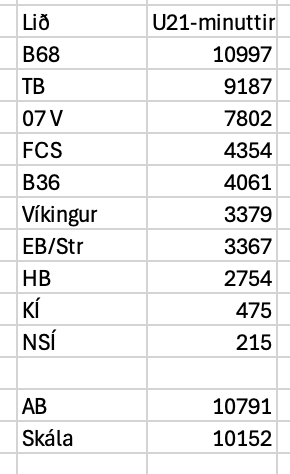 Her er yvirlit yvir, hvussu nógva spælitíð liðini góvu til ungar leikarar. Markið er sett til, at teir vóru í mesta lagi 21 ár, tá teir spældu síðsta landskappingardystin sambært FaroeSoccer. B68 gav knapt 11.000 minuttir til U21-leikarar. Hetta svarar til 41 % av samlaðu spælitiðini. Í hinum endanum lá NSÍ aftast og so KÍ beint frammanfyri. Í NSÍ vóru bara 215 minuttir givnir til U21-leikarar, sum svarar til 0,8 %. Vit síggja eisini, at uppflytararnir góvu nógva spælitíð til U21-leikarar. Sí hagtøl niðanfyri.